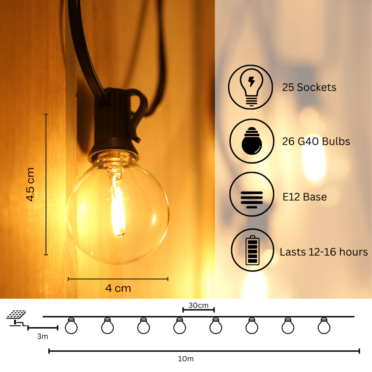Stellar Lighting 10m Solar Powered Classic 25 LED Bulb String Lights