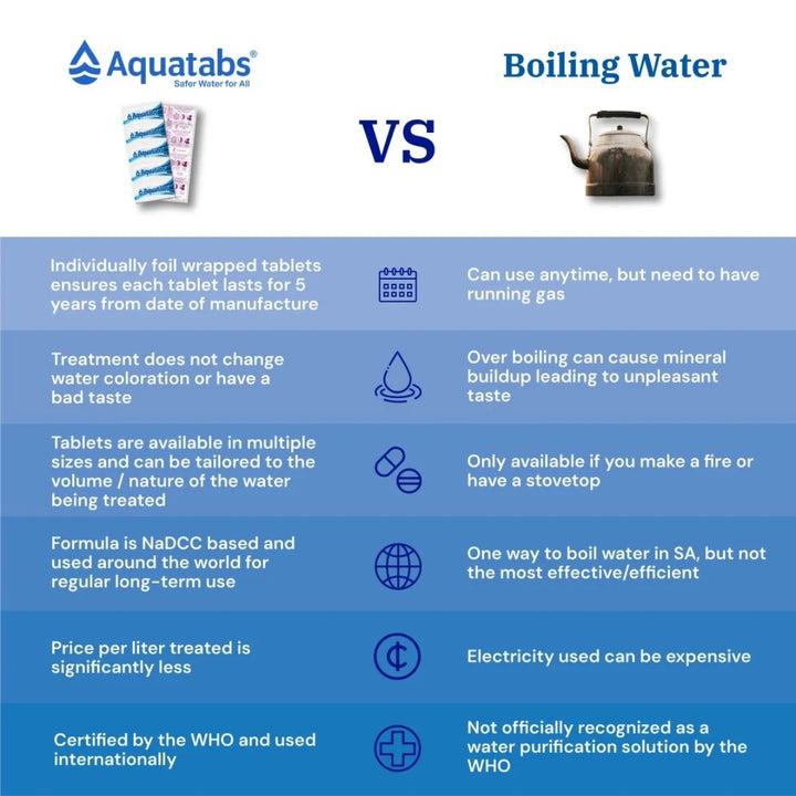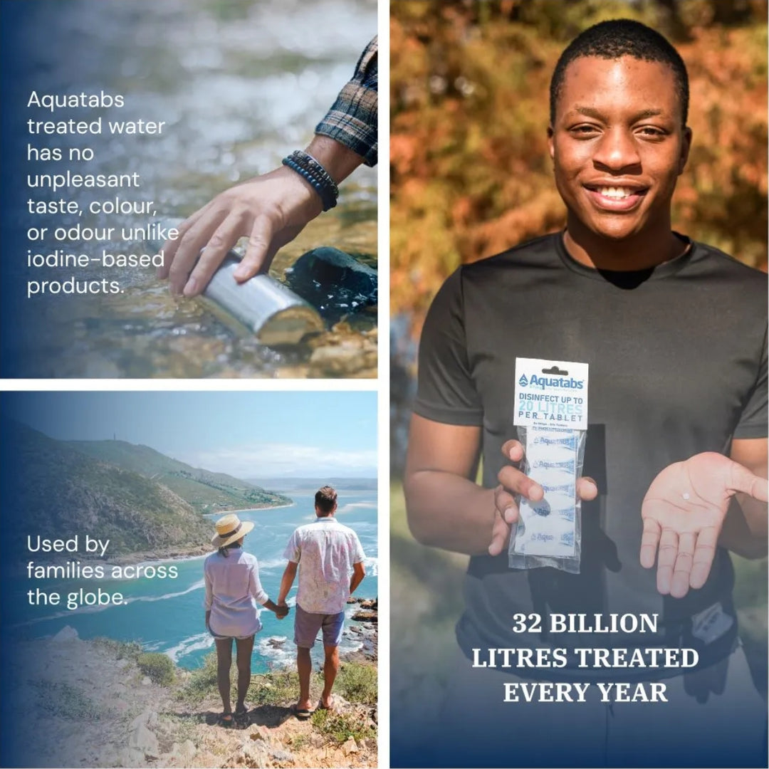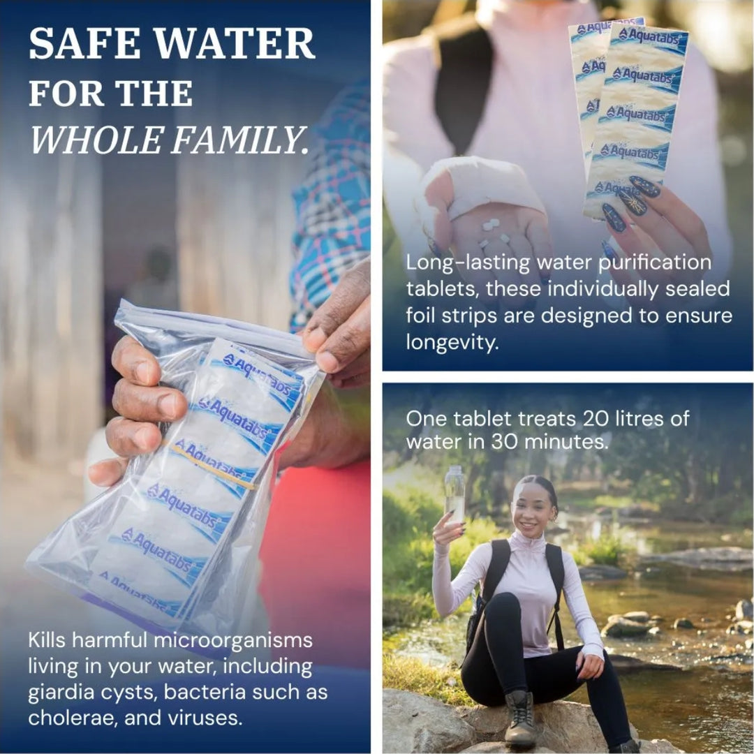 • Aquatabs are self-dissolving tablets which kill the bacteria in water to make it potable.