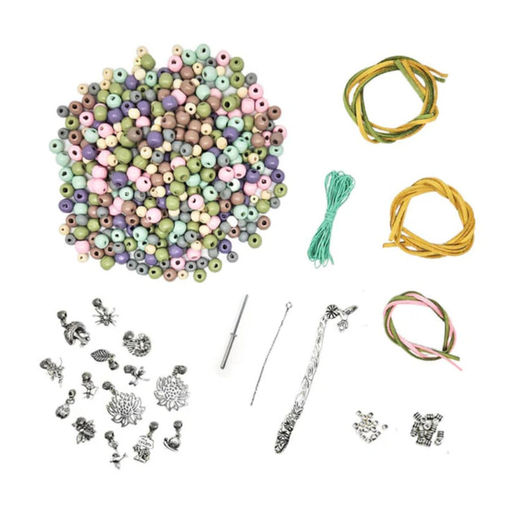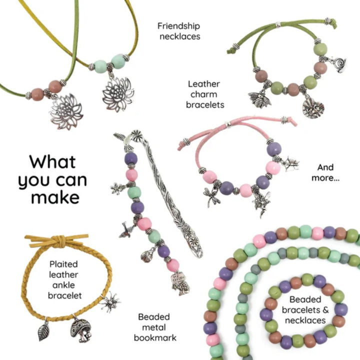 A beautifully packaged assortment of wooden beads, Garden themed charms, leather and elastic string, metal book mark and a booklet of step by step ideas. Ideal for ages 5+.