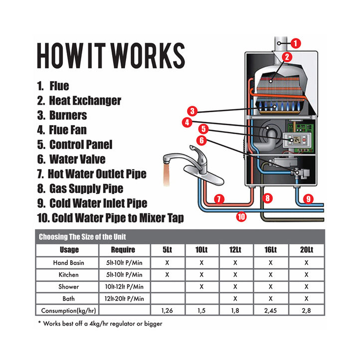 - Our gas geyser range consume different quantities of gas depending on the size.